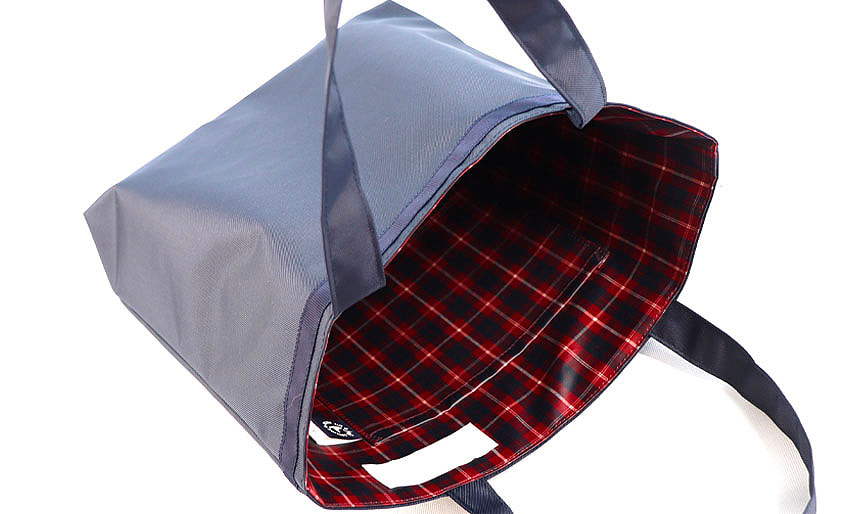 裏地のチェック地はビニールコーティング加工していますので水に強く、ハリがあり自立します。