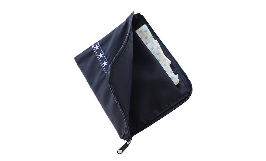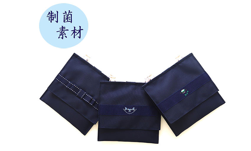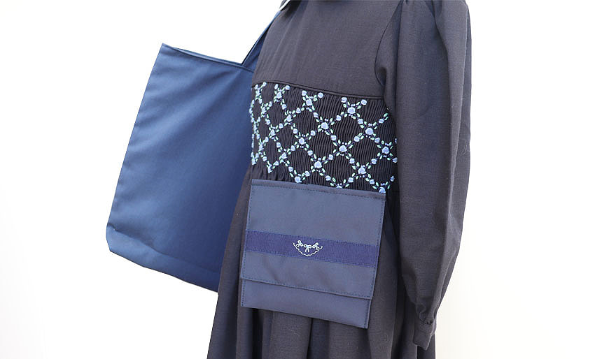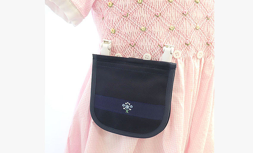 ワンポイントの刺繍やテープ使いは、どんなお洋服にも馴染みやすい清楚で上品なデザインです。ポケット正面にハンカチが収納でき、小さなお子さまでも出し入れしやすい工夫をしています。マジックテープ付きのふたを開けるとミニティッシュが収納できるようになっています。