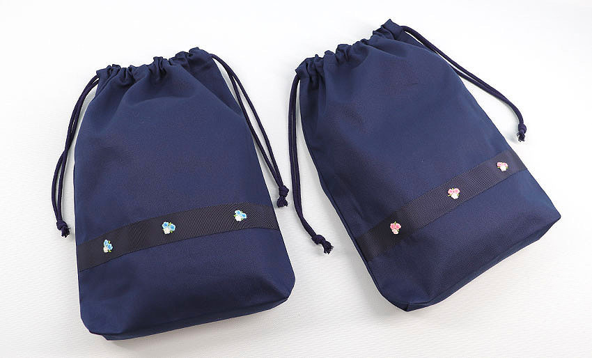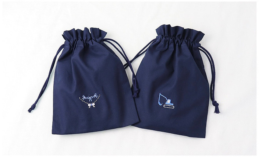 撥水加工の素材にシンプルなワンポイント刺繍をあしらった物や、美しさと温もりを感じる手刺繍入りの持ち手付き巾着袋も取り揃えております。