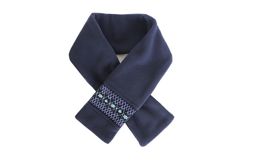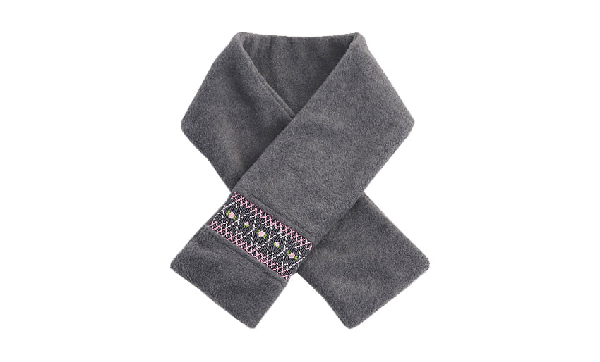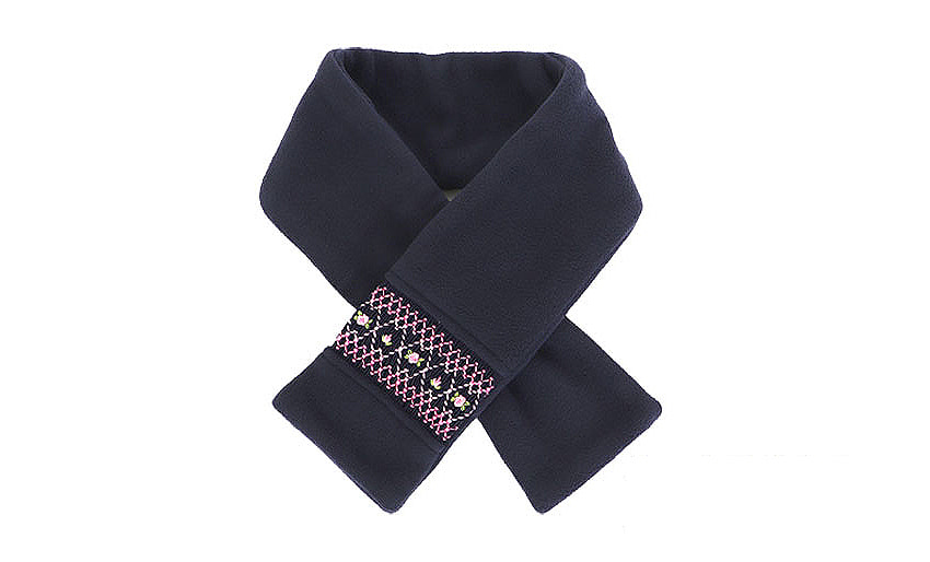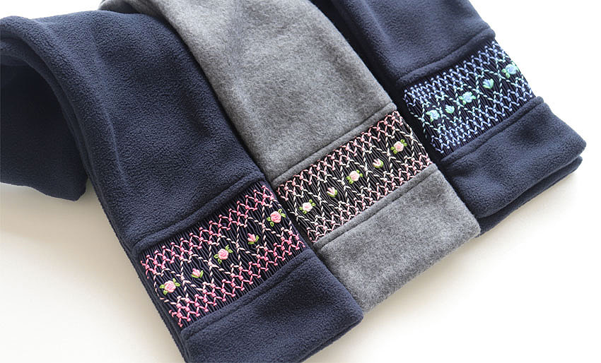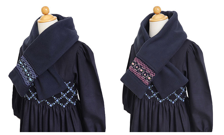 ジョリコムアンクールのマフラー・手袋は、スモッキング刺繍を施した上品なフリースマフラーが特徴的です。軽くて暖かく通園通学に最適です。