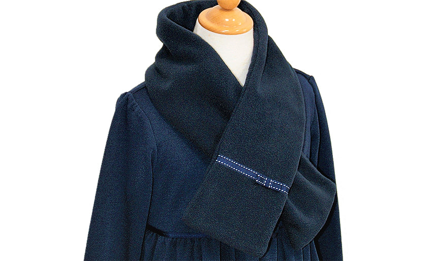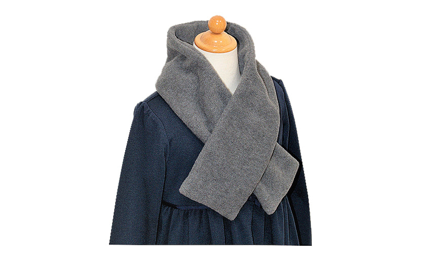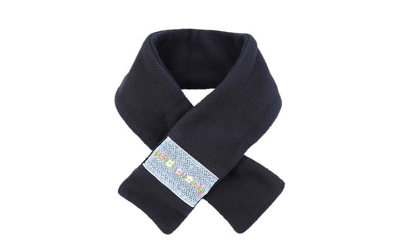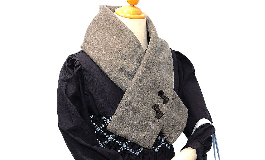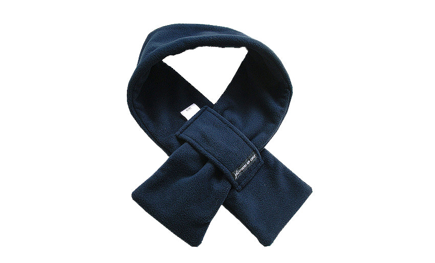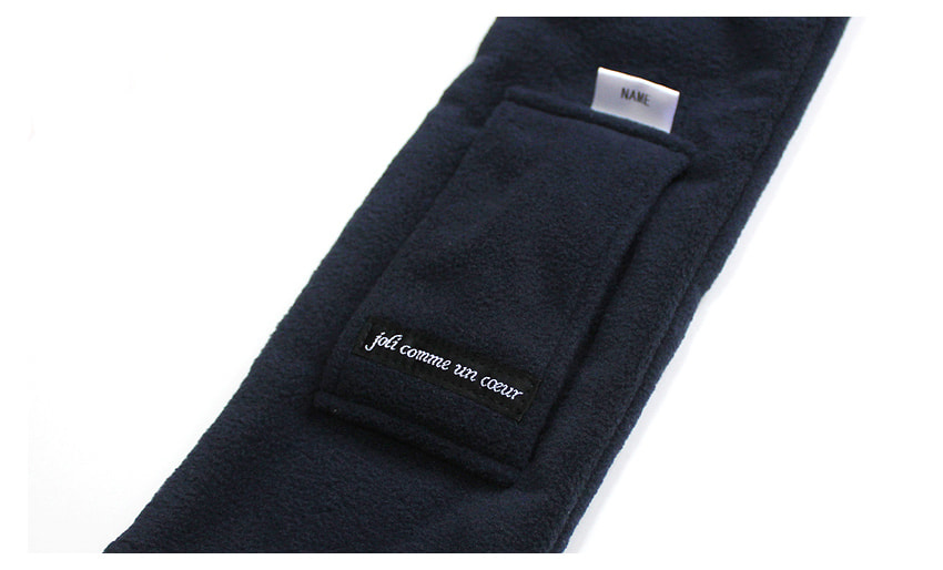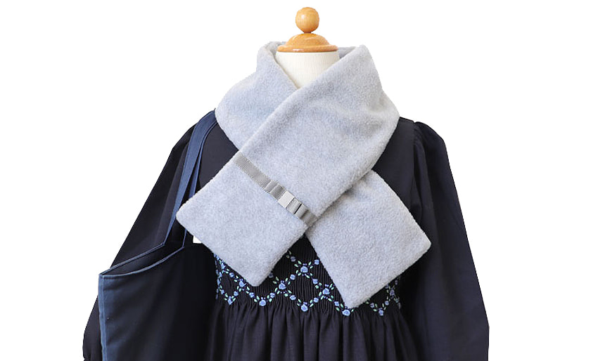 ふわふわとした肌触りの良いフリース素材が首回りを暖かく包んでくれます。背面のループに通してクロスさせるだけので、簡単に着用いただけます。内側にお名前がきちんと書けるタグ付きになります。