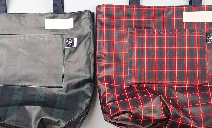裏地のチェック地はビニールコーティング加工していますので水に強く、ハリがあり自立します。